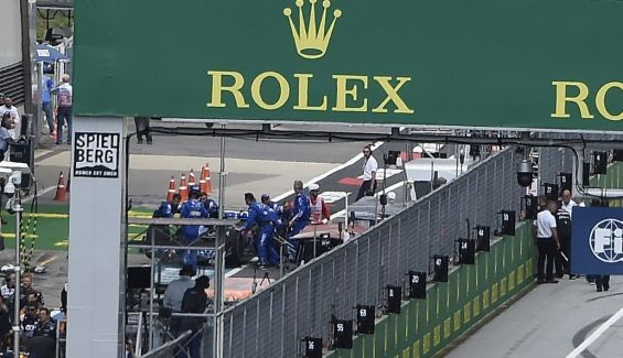 A la izquierda se ve a Fernando Alonso en el pit lane intentando sus mecánicos arrancar el Alpine