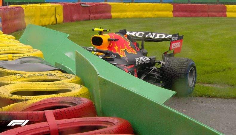 Al llegar a la curva de Les Combes, Checo Pérez perdió el control de su Red Bull, se salió de la pista y chocó con fuerza contra las protecciones, dañando la suspensión delantera derecha, por lo que no podrá tomar la salida. Pérez ocupaba la séptima posición en la parrilla.