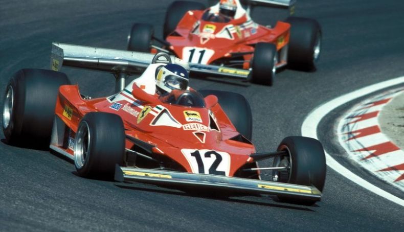 En la foto, Gilles Villeneuve en el GP de Canadá de 1978 con el Ferrari 312 T3 por delante de su compañero Carlos Reutemann. Villeneuve ganó esa carrera, su primera victoria y Reutemann fue tercero por detrás de Scheckter (Wolf Ford).