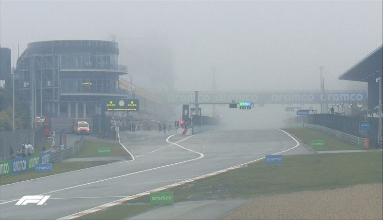 Aunque el cronómetro se puso en marcha para contar 90 minutos de sesión, el pit lane no estaba abierto, con el semáforo rojo. La razón es que el helicóptero médico no puede volar con la niebla, y por lo tanto no pueden salir los monoplazas a rodar a la pista. El hospital más cercano está a larga distancia por carretera.