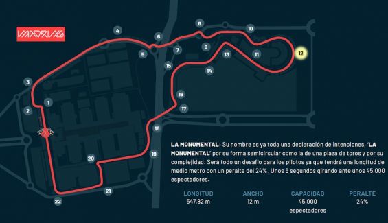 Cumpliendo ya así todos los objetivos de plazos previstos, con la previsión de que se alcancen picos de hasta 10.000 trabajadores a diario en los próximos meses y con el optimismo de haber vendido ya hasta 80.000 de las 120.000 entradas finales que se esperan alcanzar, Madring se prepara ya para albergar una cita anual en el calendario que se prevé muy importante y esperada. El circuito, que contará con 5,4 kilómetros de trazado ubicados entre el recinto ferial de Ifema y una parcela anexa del barrio de Valdebebas, está generando además mucha expectación en los últimos días. Y buena parte de la culpa la tiene ya la curva que se ha denominado La Monumental.