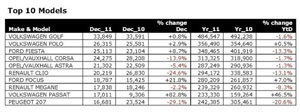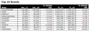 A destacar, sin duda, que tan sólo encontramos en esta lista un vehículo de un segmento que no sea el B o el C. Es decir, nueve de los diez primeros son utilitarios o compactos, y sólo uno –el VW Passat– es una berlina. Sin duda una muestra de hacia dónde se mueve el sector del automóvil, hacia modelos pequeños cada vez más capaces, eficientes y con tecnología antes sólo reservada para los modelos superiores.La firma con sede en Wolfsburgo también lidera el Top 10 de ventas en cuanto a marcas en territorio europeo. Con un ascenso del 9,1 por ciento respecto al 2010, representa a la marca con mayor incremento en su número de ventas en 2011, con un total de 1.678.279 unidades. Por detrás se ubica Ford, con un total de 1.087.912 unidades vendidas durante 2011, lo que supone una caída del 2,8 por ciento.