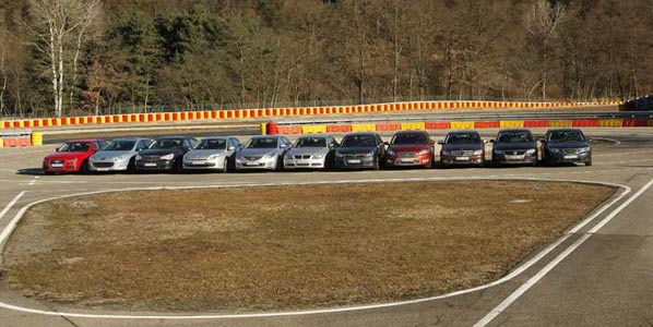 No doy crédito a la habilidad con que ese Skoda Roomster nos adelanta y se va deshaciendo de cada uno de nosotros, una fila de once coches por Suiza en busca de carreteras singulares en dirección a Italia. En la primera parada, constato que forma parte de esta comitiva, es el vehículo rápido del fotógrafo para adelantarse e inmortalizarnos a nuestro paso. Una comitiva a la que me he unido en Stuttgart para probar y comparar, junto con una quincena de compañeros periodistas de diversos países europeos, once berlinas medias. Resulta que debe de ser genético, porque el conductor, mejor dicho, la conductora del Roomster, lleva por apellido Winkelhock, hija del fallecido piloto de F-1 Manfred Winkelhock. En realidad no deberían sorprenderme estas colaboraciones, porque hace diez años conocí a su hermano, un Markus todavía sin carné y entonces aprendiz de fotógrafo de coches, este año debutante en un Gran Premio en el Spyker.Yo me sumo tarde a esta reunión, porque hace ya dos semanas que los especialistas de ensayos en pista de Motorpresse llevan midiendo y analizando hasta la saciedad las reacciones en situaciones de emergencia de estas once berlinas. Test del alce, simulación de adelantamientos apurados volviendo al carril de golpe, frenada con las ruedas de un lateral sobre firme poco adherente, agarre máximo, ciclos de diez frenadas sin descanso desde 100 km/h… Son las pruebas habituales de lo que hemos bautizado Master-Test, en el que las revistas de nuestro grupo editorial unen fuerzas y sus puntos de vista, desde Grecia a Suecia, pasando por Suiza o Croacia. Ni los criterios de los compradores, ni sus necesidades, ni los precios se parecen, sólo queda como común denominador las virtudes del producto, su espacio, su confort, sus habilidades dinámicas y su seguridad.El sesenta por ciento de nuestras puntuaciones salen de los ensayos de seguridad dinámica en las pista de pruebas. Hockenheim, Boxberg y Lausitzring han sido los escenarios donde se han realizado las pruebas, porque no hay una pista única en la que se puedan realizar todos los ensayos y ni siquiera consiguen hacerlas así los propios fabricantes de los automóviles. Aprovechando el paseo hacia el norte, parada en Lippstadt durante dos días para realizar ensayos de iluminación en el túnel del fabricante Hella (ojo, no son los que ganan, que nadie sea malpensado) y posteriores recorridos durante la noche para comparar situaciones reales de conducción.El cuarenta por ciento de los puntos que siguen en el aire son más subjetivos, aunque resulta fácil cuando te bajas de un coche y pasas al siguiente. Para esto sirvieron esos mil kilómetros desde Stuttgart —donde nos sumamos a la prueba— hasta que dejamos la reunión en Italia. En algunos aspectos puramente un tramo de enlace, porque llevábamos ruedas de contacto para transitar por los Alpes nevados y con cortes de circulación para camiones a causa del mal tiempo. En Italia nos encontramos esas carreteras con mal firme e incluso pistas de tierra alrededor del nuestra punto-base (un hotel de golf entero para para nosotros, en la temporada de “green" congelado), sobre las que juzgar la capacidad de filtrado y el confort de cada una de las cinco plazas. Y finalmente, allí pudimos comprobar, que por eso nos habíamos ido tan lejos, el uso al límite sobre piso mojado y sol radiante en la pista de Pirelli en Vizzola, justo a orillas del aeropuerto de Milan. Un trajín de tres semanas y 4.000 km que un cuadro de calificaciones intenta sintetizar y desglosar. Un trajín con un claro ganador, el nuevo Audi A4. Y no es publicidad.