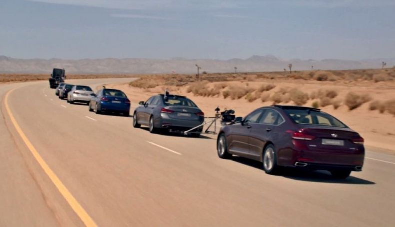 La firma surcoreana ha dispuesto seis unidades de su Hyundai Genesis en su pista de pruebas en el desierto de Mojave, en California (EEUU) para probar las bondades de estos sistemas tecnológicos. Puestos en línea, todos los Genesis a excepción del primero se quedan sin conductor y son capaces de moverse por sí solos.