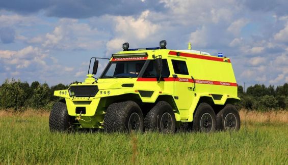Esta espectacular ambulancia, para empezar, se levanta a partir de enormes neumáticos especiales desarrollados por Avtoros, de 1,2 metros de altura y más de medio metro de ancho, construidos específicamente para este todoterreno 8x8. Con una gran área de contacto y muy baja presión de aire, sobre estas ruedas se propulsa un vehículo de cuatro ejes, que puede pesar hasta cuatro toneladas. Los neumáticos, por si fuera poco, hacen también la función de flotadores, permitiéndole avanzar por superficies como pantanos.