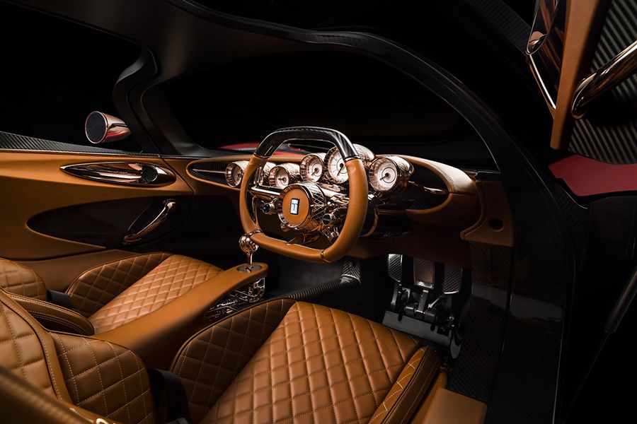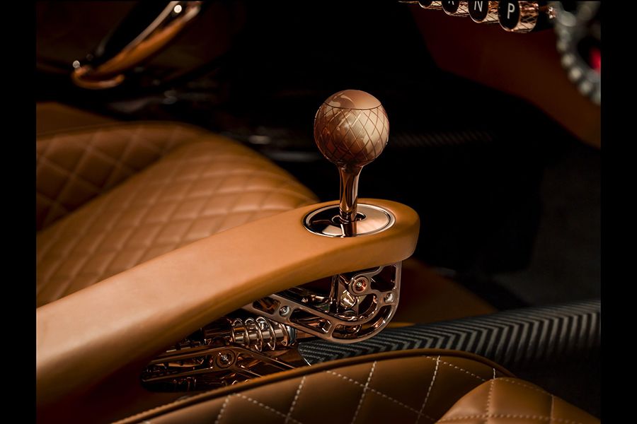 Por increíble que parezca, el interior del P72 es aún más cautivador que su carrocería. La disposición de los asientos, la piel color caramelo en patrón de rombos que cubre cada superficie táctil, la consola central con el varillaje de la transmisión expuesto, y el tablero que parece haber sido confeccionado por un joyero artesano, son el complemento perfecto para su elegancia exterior. Desde el Spyker C8 Preliator, no habíamos visto un habitáculo tan detallado y enfocado a la belleza pura.