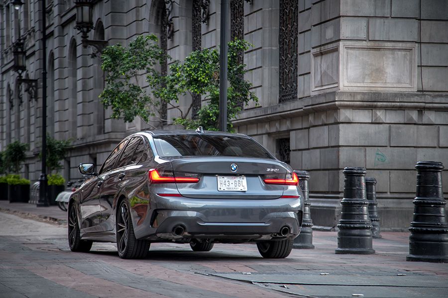 Aunque sólo podemos apreciar la trasera, hay detalles que nos dicen de forma inequívoca que no estamos ante un Serie 3 convencional. Además de acabados negros, vemos un spoiler labial bastante elevado sobre la cajuela, además de fascia distinta, un deflector más agresivo y tubos cuádruples de escape.