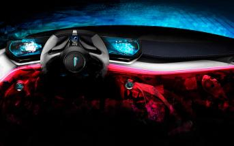 El minimalista interior, revestido de cuero con costuras azules y fibra de carbono –que también conforma la carrocería-, apenas cuenta con un par de botones, combinando pantallas con superficies táctiles. Distinguimos un instrumental digital enfocado totalmente al conductor, un volante cuadrado y asientos envolventes.