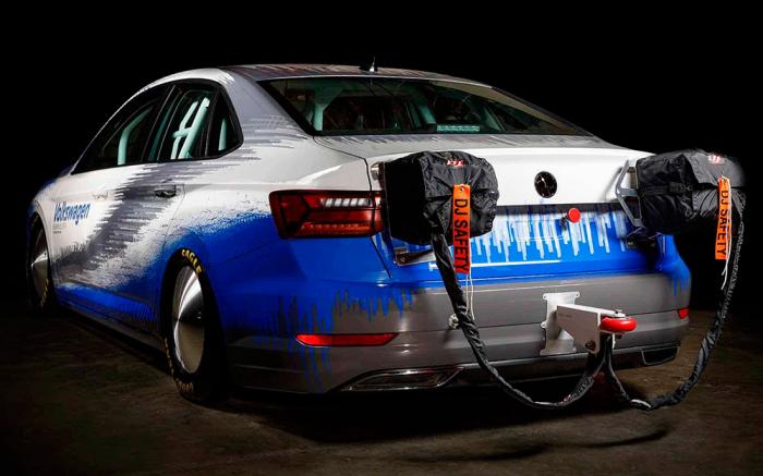 También está un diferencial de deslizamiento limitado, dos paracaídas para frenarlo, una jaula antivuelco y una inconforme cromática exterior. Además de aprovechar el coeficiente de arrastre de 0.27 del Jetta, en Volkswagen señalan que este experimento es para remarcar la deportividad de su sedán, como previo a la siguiente generación del GLI.