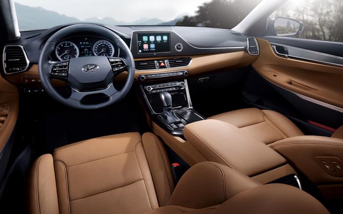 Como se esperaba, recibe una fuerte influencia de los productos de la división Genesis, que contra las formas más afiliadas vistas en lanzamientos recientes como el Elantra, nos encontramos con una gran parrilla de corte vertical y largos faros.
