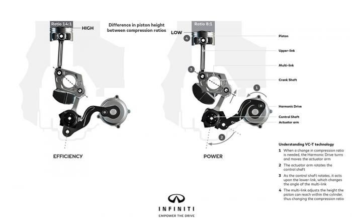 El principio se basa en un juego de bieletas con múltiples articulaciones de mecanismo excéntrico que varían la longitud del movimiento del pistón (carrera), alterando su recorrido en un rango infinito a través del cilindro y por tanto los puntos extremos de compresión/escape y de admisión/expansión. Además de hacer innecesarios los árboles de balanceo, la relación de compresión varía entre máxima entrega de potencia (relación 8:1) o eficiencia de combustible (14:1) según se requiera, todo sin intervención del conductor.
