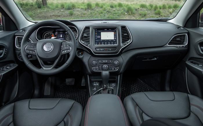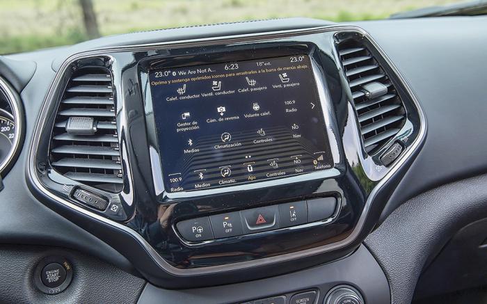 Lo que salta a la vista es la conseguidísima diferenciación entre la Overland y la Trailhawk: la primera opta por una piel muy suave recubriendo el tablero, un poste A forrado en tela, un acento de madera sobre el aro, vestiduras contrastantes e incluso cristales laterales laminados adelante. En conjunto el resultado es una cabina muy agradable para largos trayectos, pues a lo mencionado se une una enorme dotación de accesorios (hay hasta calefacción en el volante e hilera de adelante con ventilación) y una interfaz UConnect que siempre ha sido fácil de operar desde la pantalla táctil, los mandos redundantes físicos abajo de la misma o desde el volante.