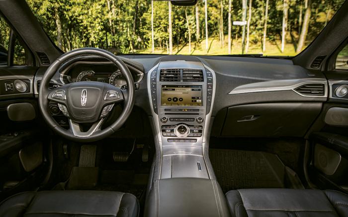 No es necesario convivir demasiado en el interior del MKZ para darse cuenta que le han puesto empeño a los detalles, que han trabajado de más y no solo para cumplir un estándar. El centro del volante o toda la zona superior del tablero y puertas están recubiertos en piel, mientras partes menos visibles, que por lo general están rematadas con superficies rígidas, se encuentran mullidas. Tratándose de un Lincoln, los instrumentos y la interfaz en la pantalla táctil recurren a tonalidades más sobrias para su iluminación.