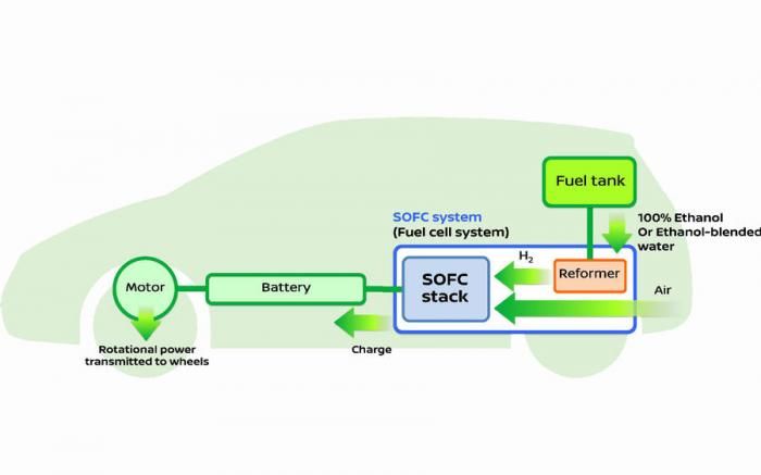 El sistema denominado e-Bio, obtiene el hidrógeno a partir de etanol mediante una oxidación sólida, lo que no suena descabellado cuando la molécula de este compuesto (en estado puro) está formada por seis átomos de hidrógeno, uno de oxígeno y dos de carbono (CH3-CH2-OH). El etanol podría estar mezclado con hasta un 55% de agua, a decir de Nissan, lo que lo haría mucho más barato que la gasolina. Actualmente, el llamado Bioetanol, obtenido de diversas plantas, es muy popular en Brasil y en ciertas regiones de Asia como un medio para aumentar potencia.