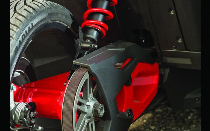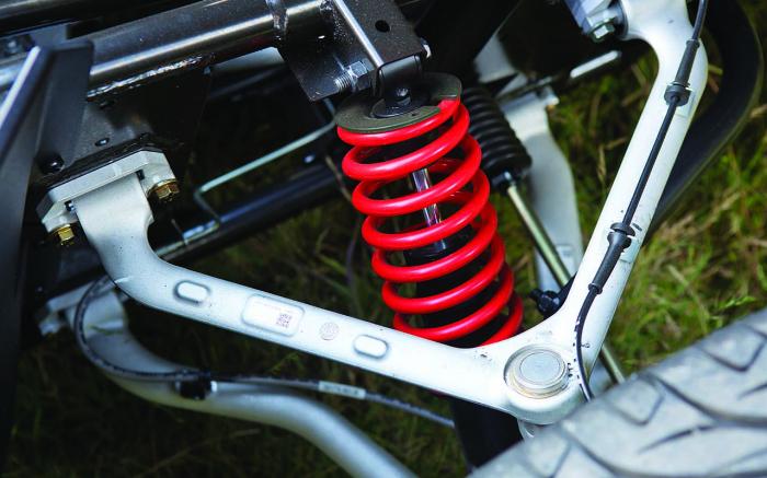 Esa única rueda detrás de las dos plazas, además de encargarse de propulsarnos, brinda mucho del apoyo al afrontar los giros. Exigiéndolo en tramos sinuosos, después de un levísimo quejido del eje frontal, la cola empieza a querer redondear marcadamente la trayectoria y con algún brinco de esa única rueda posterior, cuando llega a perderse el agarre y éste se recupera de nuevo. La suspensión no peca de blanda y contiene bien las inercias, siendo el único obvio sacrificio un andar en ciudad tirando a tosco, una característica natural mas no un defecto.