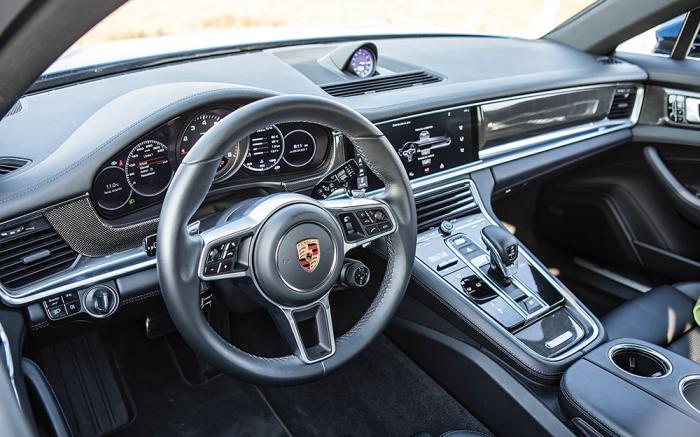 El Panamera es el primer exponente de las cabinas que veremos en Porsche en los años venideros. La consola central sigue siendo enorme, pero el desfile de botonería se ha simplificado con mandos táctiles delante del selector de cambios que abarcan distintas temáticas, con íconos redundantes desplegados a la izquierda de una enorme pantalla. Memorizar su orden no es complicado y su acción se delata con un sonido y/o una vibración. Tanta limpieza y facilidad para gestionar tantos elementos de equipamiento se ayuda por submenús bien definidos, íconos y letreros claros y gráficos muy elaborados pero nada complicados de entender. Esa simpleza no va en detrimento de un ambiente que por obligación tiene que ser lujoso. Nuestra unidad equipaba molduras en fibra de carbono acompañadas por piel en el tablero en la zona superior e inferior, en las puertas y en parte de la consola central, con mínima presencia de superficies en plástico y, más allá de los materiales utilizados, una atención a los ajustes y una sensación de solidez que no nos hace pensar en un auto delicado pese a su perfil. Nuestra única queja, siendo muy perfeccionistas, es que el botón de cerrado del portón de la cajuela no está iluminado.