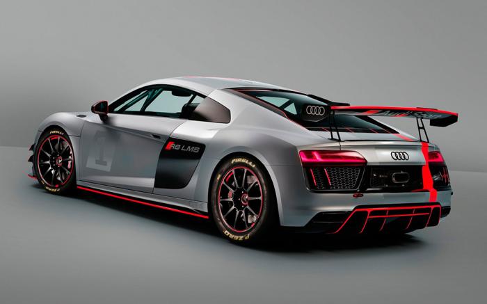 El LMS GT4 comparte un 60% de componentes con el R8 de calle, incluyendo el motor V10, que ha sido limitado 495 HP por cuestiones de reglamento. Además de la pintura de carreras y el gran alerón de pedestal, hay una gran salida de aire en el cofre, alerones delanteros, y un escape en posición central, mientras que el techo cuenta con una apertura especial para facilitar la salida del piloto en caso de accidente.