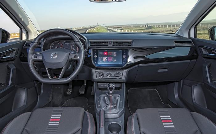 En cuanto al interior, los mejores acabados los vemos del lado europeo. El Ibiza posee terminados de muy buena calidad y en esta versión FR hay detalles que enamoran como las vestiduras específicas o los paneles laqueados tipo piano en el tablero. Además, su pantalla táctil resulta más grande, a veces más sensible de lo esperado. Su cúpula agrupa correctamente sus relojes y la pantalla central ofrece suficiente información del viaje.