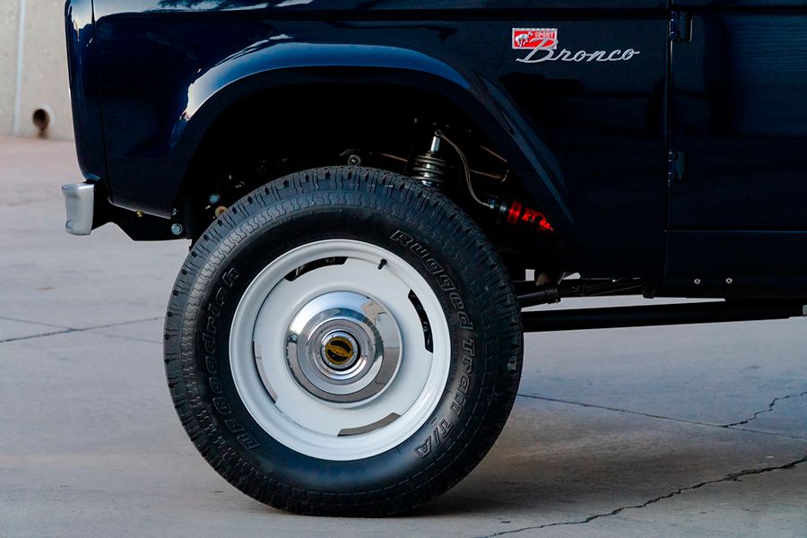 Kincer también se encargó de fabricar un bastidor reforzado que no se doblara como gelatina cuando se le aplicara semejante potencia. Las suspensiones cuentan con amortiguadores y barras estabilizadoras Fox Racing, y los frenos corrieron a cargo de Wilwood. El detalle que le da a la Bronco su estilo ‘original’ son los rines de acero de Detroit Steel Wheels, envueltos en llantas BF Goodrich Rugged Trail.
