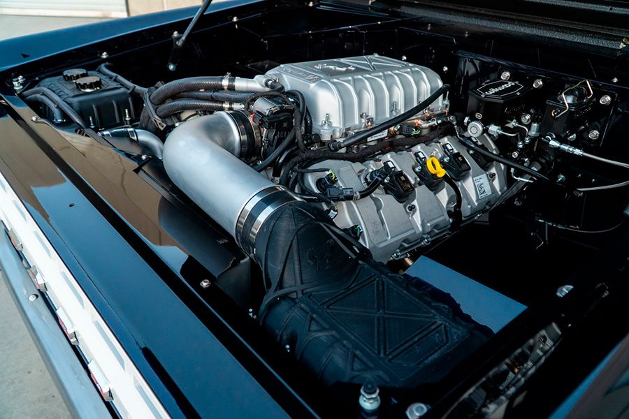 A pesar de que parece estar restaurada a condiciones originales, la realidad no podría estar más alejada de eso. Bajo su cofre, la Bronco de Leno esconde el V8 ‘Predator’ de 5.2 litros supercargado del nuevo Shelby GT500 2020, con 760 hp y 650 lb/pie de torque, acoplado aquí a una transmisión manual Tremec de 5 cambios, que deriva en un tren motriz de tracción integral cortesía de Kincer Chassis, la compañía que tiene la licencia exclusiva de Ford para la reproducción de carrocerías, chasises y componentes de la Bronco de primera generación.