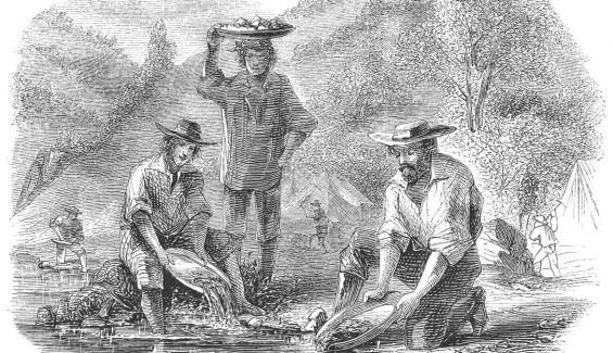 El primer descubrimiento de oro de California tuvo lugar el 24 de enero de 1848, cuando un carpintero de Nueva Jersey, James Marshall, vio una pepita en una carrera de molino que estaba construyendo en el aserradero de John Sutter. El descubrimiento se mantuvo en secreto a propósito, pero se corrió la voz. Y, para el verano de 1848, los buscadores de oro comenzaron a inundar el área alrededor de Sutter's Mill, en el centro-norte de California.