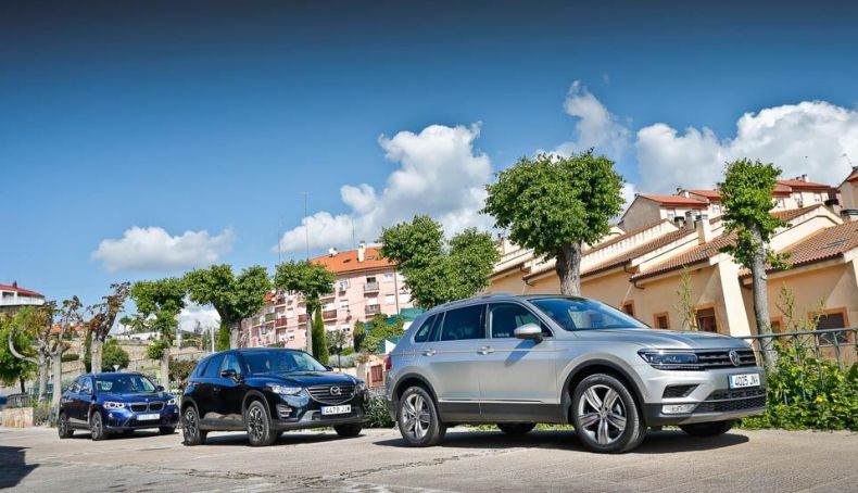 Los SUV están pegando fuerte y ya no hay marca que se precie que no ofrezca ya una gama variada en tamaño y precio. Acabaron con la moda monovolumen con una velocidad casi tan rápida como lo hizo en su momento el Diesel de inyección directa con los motores de gasolina, y se han impuesto en las listas de ventas frente a las berlinas familiares, que también tuvieron su momento de gloria y ahora se siguen resistiendo. Al final hay algo de lógica en todo esto; un SUV es estéticamente más acertado que un monovolumen y algunos ofrecen una modularidad interior similar, además de que puede pasar por más sitios, aunque la mayoría de sus compradores no lo precisen. En esta comparativa se enfrentan tres buenos modelos: BMW X1 18d, Mazda CX-5 2.2d y Volkswagen Tiguan 2.0 TDI. Todos ellos con motor diésel, tracción total y cambio automático.