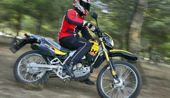 He de reconocer que cuando vi aparcada por primera vez la Hyosung RX 125 D en el garaje de la redacción, pensé que se trataba de una especie de «remake» de aquellas trail con las que soñé cuando era un joven estudiante, ¡Mecachis! Tampoco hace tanto tiempo. Me refiero a aquellas Honda CRM o Yamaha DT con las que mis compañeros más pudientes venían a clase. Por aquel entonces se utilizaban humeantes motores de 2T, cuyas prestaciones resultaban más que suficientes. Ahora, con la generalización de motores de 4T, la problemática medioambiental y las restricciones que todo ello conlleva, parece increíble que un pequeño monocilíndrico de tan sólo 125 cc pueda obtener prestaciones similares. Como ya he comentado, la estética de la Hyosung RX 125 D nos recuerda cómo eran las motos trail de hace unos años, si bien sólo se queda en la estética, ya que su motor es un moderno monocilíndrico con refrigeración mixta aire/aceite de fabricación propia, alimentado por un carburador y que supera la restrictiva norma Euro-3 en cuanto a emisiones contaminantes se refiere. Como ya he comentado, la estética de la Hyosung RX 125 D nos recuerda cómo eran las motos trail de hace unos años, si bien sólo se queda en la estética, ya que su motor es un moderno monocilíndrico con refrigeración mixta aire/aceite de fabricación propia, alimentado por un carburador y que supera la restrictiva norma Euro-3 en cuanto a emisiones contaminantes se refiere. Como es de suponer, la Hyosung RX 125 D no sorprende por ser una maravilla, ahora bien, cumple sobradamente y sin despeinarse en todo momento. Su motor vibra a altas revoluciones, aunque si preferimos circular tranquilamente nos moverá sin vibración alguna. En definitiva, tiene doble carácter, hasta la mitad –carece de cuentarrevoluciones– es tranquilo y permite movernos con cierta soltura, mientras que en la zona alta empuja con mucha más energía y brío. Las suspensiones tienen un reglaje blandísimo, tanto delante como detrás, lo que penaliza en carretera con leves movimientos, en cambio cuando entramos en el campo su comportamiento mejora, ya que se lo tragan absolutamente todo, debido también a su largo recorrido.